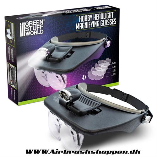 Forstørrelsesglas med lys er også kendt som pandebåndsforstørrelsesglas eller hovedforstørrelsesglas. De består af et pandebånd, der passer rundt om brugerens hoved, med et par linser, der kan justeres for forstørrelse. Linserne er udskiftelige, så brugeren kan skifte mellem forskellige forstørrelsesniveauer afhængigt af den aktuelle opgave. Det inkluderer 4 forskellige linsemuligheder som følger: 1,2x, 1,8x, 2,5x og 3,5x.
