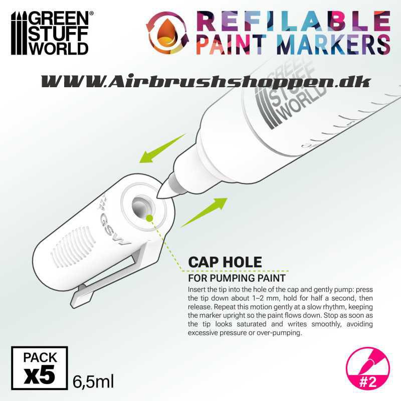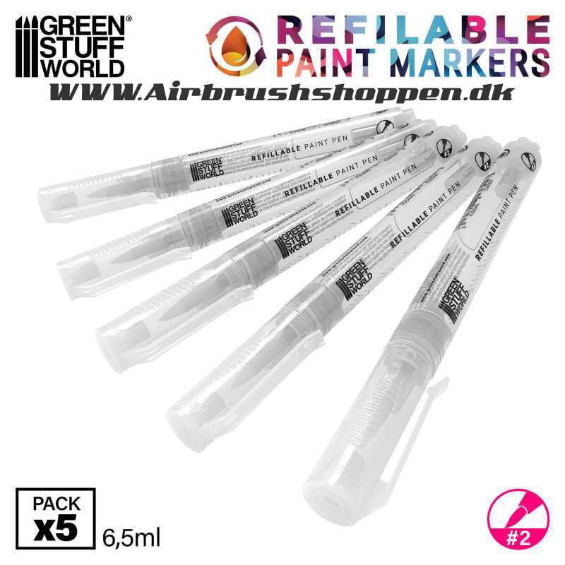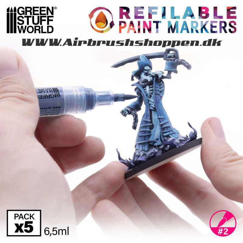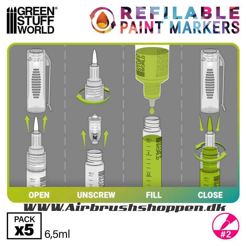 Green Stuff World genopfyldelige tuscher tilbyder en innovativ og praktisk måde at påføre forskellige typer maling på dine miniaturer, såvel som modellerings-, kunst- og hobbyprojekter. Deres fine filtspidser er kompatible med en bred vifte af produkter, lige fra modelmaling og metallisk maling, alkoholblæk, krommaling og endda oliemaling, hvilket gør dem til et alsidigt værktøj for enhver miniaturemaler, tegneseriekunstner eller endda illustrator.