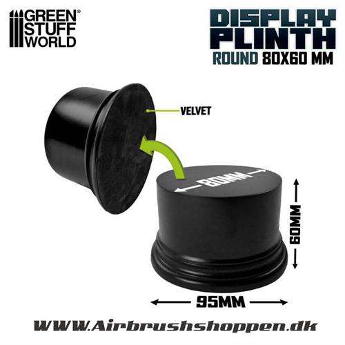 En rund søjlelignende udstillingsokkel lavet af MDF-træ med lakering, ideel til udstilling af dine miniaturefigurer. Træbasen har en blød, grøn filtbund.