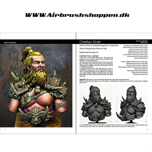 I dette nummer vil vi dække den detaljerede maleproces af en vikingebuste i stor skala 1/10 (med nogle fantasielementer) fra det velkendte sydkoreanske firma Nuts Planet. Mesterkunstneren Ernesto Reyes Stalhuth forklarer på 28 sider sin maleproces, der inkluderer, hvordan man bruger malerpensler, airbrushen og en våd palet. Bemærk venligst, at han også nedskrev de omtrentlige blandingsforhold for penselmaling med en våd palet og for airbrushing (nøjagtig match). Alle disse er dækket af 91 trin-for-trin-billeder.