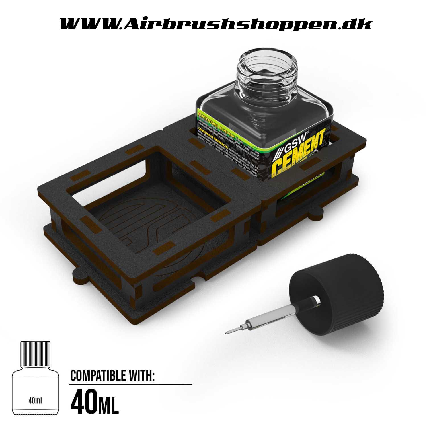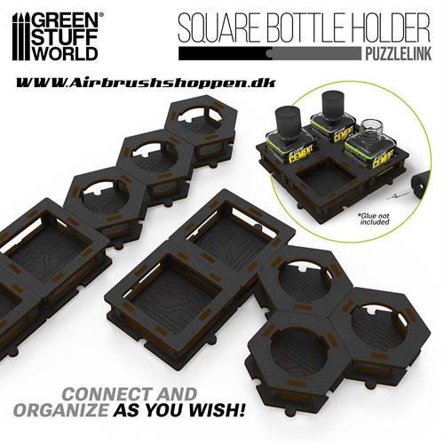 Designet specielt til de firkantede glasflasker, der almindeligvis bruges til plastcementlim, nogle modelmalinger og panelforinger, er den et perfekt match til populære formater som Tamiya-cementflasker og lignende beholdere. Holderen holder flasken fast på plads, samtidig med at den giver hurtig adgang til låget og penselapplikatoren.